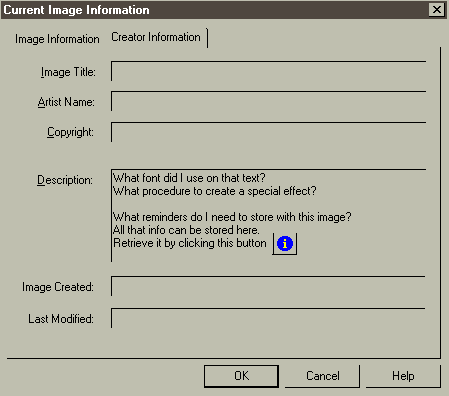 selections & masks from each other. Pretty cool. You must keep a master copy of the picture in it's native .psp format in order to retain access to those privately stored goodies in the Alpha Channel. If you convert that image into another format besides native .psp -> Your secret Alpha Channel closet is zapped into oblivion and anything in it (selections masks creator information, and oh yes, your image layers too) will be gone. ![]() Menu> View> Image Information to access Creater Information on your current image or custom install that little blue button on your toolbar. |