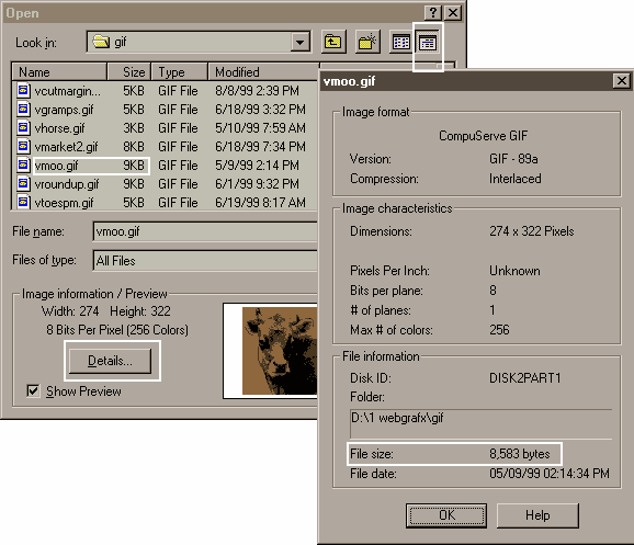 ![]() Don't look down here for true file sizes This heartbreaking number is not the real deal. The vmoo.gif file is actually only 9K ![]() Don't look here either. These 2 spots may appear to be our most likely source but they do not reflect the actual compressed numbers we need. Especially for our GIFs and JPGs. |