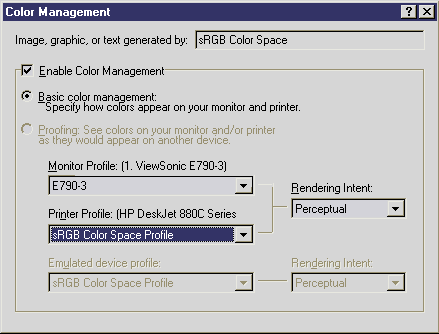 It means there is no such thing as "what you see is what you get" because it is simply impossible to render every monitor color on a printer. Color Management gets around this as follows. Each color gamut is mathematically related to a common reference color space. This common reference space allows devices to talk to each other in a common color language, so any device color space can be converted to any other via the common reference space. The conversion uses information from the device profile. In Windows the reference color space goes by the name sRGB and its gamut is similar to the monitor gamut. The conversion from device to reference color space is done by squishing or deforming the device gamut (officially called gamut mapping). There are a number of ways to do this squishing and how it is done is controlled by the Rendering Intent. The effect of all this is to hide the mismatch between the colors that can be displayed on a monitor and a printer. It does not, however, result in _exactly_ the same colors being displayed. As a result, Color Management helps you get better agreement between screen and print but is not a magic bullet that "makes color always come out the same everywhere". I need more. Windows Color Management http://www.microsoft.com/hwdev/devdes/icmwp.htm http://www.microsoft.com/HWDEV/color/default.htm More about sRGB http://www.srgb.com/ More about device profiles http://www.color.org/ |